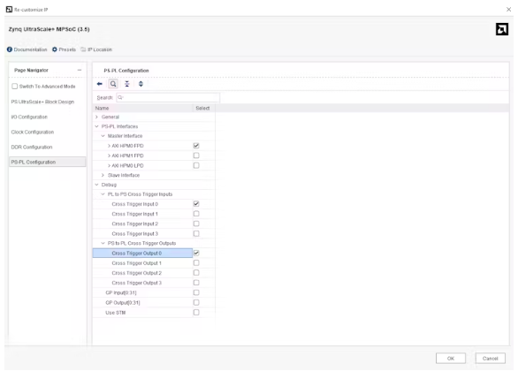 重新定制處理系統(tǒng)以禁用HPM1,并啟用PS到PL和PL到PS的交叉觸發(fā)。這種交叉觸發(fā)允許ILA和Vitis Unified環(huán)境相互觸發(fā)。