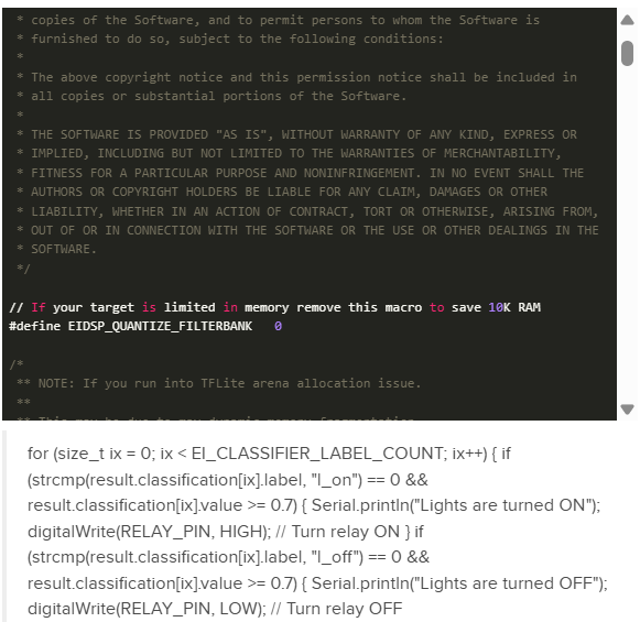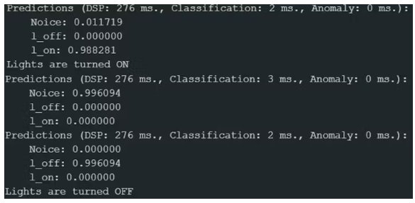 這部分代碼遍歷機器學(xué)習(xí)模型輸出的每個預(yù)測(或標(biāo)簽)。對于每個標(biāo)簽,它首先檢查標(biāo)簽是否為“l(fā)_on”(意思是“燈亮”),以及模型對該標(biāo)簽的置信度是否為70%或更高。如果兩個條件都為真,它打印“燈已打開”到串行監(jiān)視器,然后發(fā)送一個高信號到繼電器引腳,它打開連接的燈。同樣,它檢查標(biāo)簽是否為“l(fā)_off”(意思是“關(guān)燈”),以及置信度是否至少為70%。如果是,它打印“燈已關(guān)閉”,并發(fā)送一個低信號到繼電器,關(guān)閉燈。這種邏輯允許系統(tǒng)對模型識別的特定語音命令做出反應(yīng),并相應(yīng)地控制燈光,但前提是模型對聽到的聲音有足夠的信心