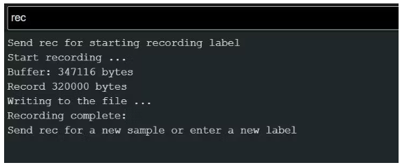 發(fā)送標(biāo)簽(例如,l_on, l_off)。程序?qū)⒌却硪粋€命令:rec。每次發(fā)送命令rec時,程序?qū)㈤_始記錄新的樣本。文件將保存為l_on.1.wav、l_on.2.wav、l_on.3.wav等,直到發(fā)送新標(biāo)簽(例如,notice)。在這種情況下,您應(yīng)該為每個新示例發(fā)送命令rec,它將被保存為Noice1.wav, noice2 .wav, noice3 .wav等。最后,我們將在SD卡上獲得保存的文件。