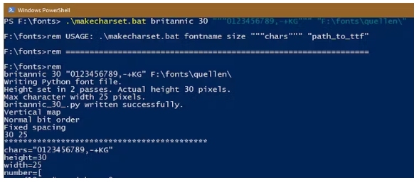 .\ Makecharset.bat Britannic 30 "" 0123456789, -+KG "" “F: \ fonts \ sources \”
