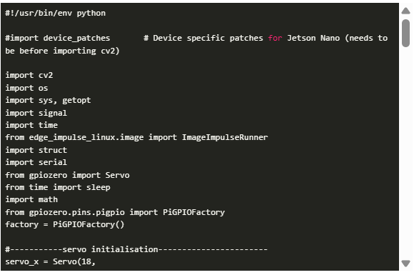 在樹莓派方面,代碼正在python環(huán)境中使用opencv庫以及預訓練的機器學習模型執(zhí)行。如上所述,在從邊緣脈沖服務器下載機器學習模型時生成Python代碼。需要注意的一點是,我們必須根據(jù)自己的需要對其進行修改。在我的情況下,我必須提取對象的x, y坐標值,通過art傳遞給arduino板。