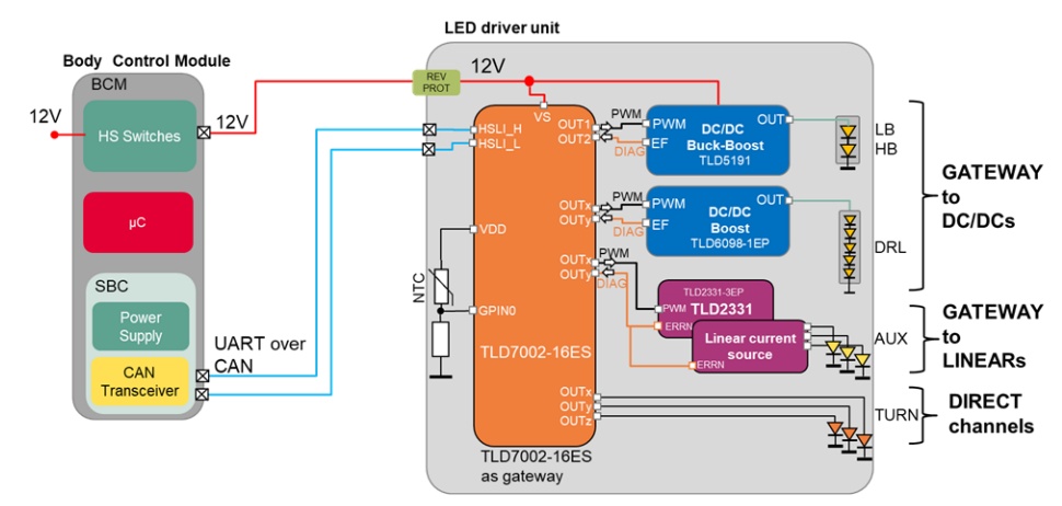 在現(xiàn)代汽車中,眾多電子控制單元(ECU)負(fù)責(zé)控制各種功能,如發(fā)動(dòng)機(jī)管理、傳動(dòng)控制、制動(dòng)系統(tǒng)和信息娛樂(lè)系統(tǒng)。每個(gè)ECU通常都配備有自己的MCU,這增加了汽車電氣架構(gòu)的總體復(fù)雜性和成本。車燈的情況也是如此,前后左右的車燈通常都有各自獨(dú)立的ECU。尤其在一些車燈包含成百上千個(gè)像素,或者燈是由多塊分散的印刷電路板(PCB)組成時(shí),以市場(chǎng)現(xiàn)存大量量產(chǎn)的LED驅(qū)動(dòng)解決方案而言,每個(gè)燈板都需要使用一片MCU來(lái)作為控制的轉(zhuǎn)發(fā)點(diǎn)來(lái)提升系統(tǒng)的可靠性,通訊速度以及電磁兼容(EMC)性能。本文以TLD7002-16ES為例,提出了一種使用UART OVER CAN通訊接口來(lái)降本并且提升EMC性能的解決方案。