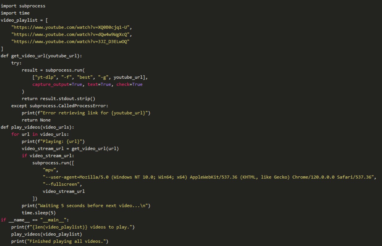 為了使整個(gè)過程自動(dòng)化,我們創(chuàng)建了一個(gè)腳本來播放YouTube視頻列表,每個(gè)視頻之間有5秒的暫停。