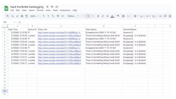 為了跟蹤播放的視頻,并與同一Wi-Fi網(wǎng)絡(luò)下不同賬號(hào)的推薦視頻進(jìn)行對(duì)比,我們使用谷歌Sheets API建立了數(shù)據(jù)記錄系統(tǒng)。