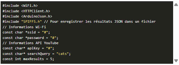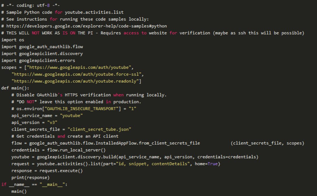 在初始設(shè)置結(jié)構(gòu)并建立Wi-Fi連接之后,意圖是連接到Y(jié)ouTube API以訪問搜索功能,以便我們可以播放有關(guān)特定主題的視頻,并以JSON格式返回結(jié)果鏈接和信息。雖然這是成功的,但我們很快意識(shí)到期望的播放在ESP32上不起作用,我們選擇將注意力轉(zhuǎn)移到使用樹莓派5上。