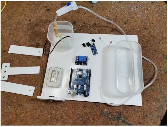 現在讓我們看看該設備在實際條件下是如何工作的。首先,出于實際原因,我將關閉水泵的電源,并測試設備的其余部分。首先,我們需要用這個小電位器來調整紅外探測器的靈敏度?,F在傳感器調整好了,我們可以連接泵了。