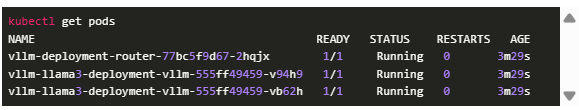 您應(yīng)該看到vLLM路由器和服務(wù)引擎的pod處于運(yùn)行狀態(tài)。你可以檢查路由器pod的日志,以確保它正確運(yùn)行并服務(wù)API請求: