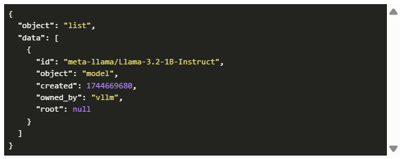 您應(yīng)該收到一個JSON響應(yīng),其中列出了vLLM堆棧提供的可用模型: