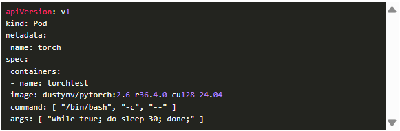 要驗(yàn)證Kubernetes環(huán)境并可能訪問pod中的GPU資源,請創(chuàng)建一個名為test的YAML文件。Yaml具有以下規(guī)格: