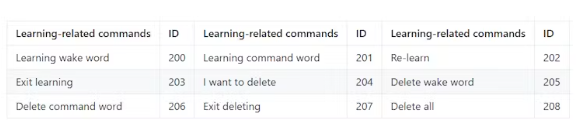 3)學習相關命令(控制命令):這些是用于與機器學習模型交互的命令詞。這些是控制命令,啟動喚醒詞和命令詞的學習和刪除。