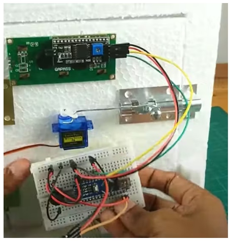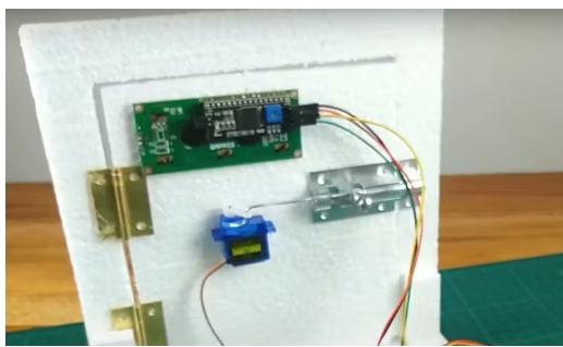 接下來,將門鎖連接到伺服電機上。用一根鐵棒。