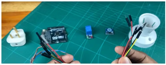 現(xiàn)在,粘貼繼電器模塊并將其連接到Arduino板。