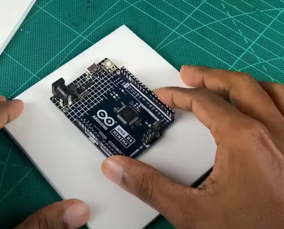接下來,將其安裝在底板上。然后。粘合Arduino UNO板。