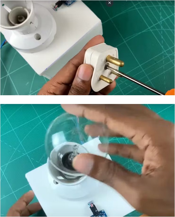 好了,現(xiàn)在把燈泡放進(jìn)燈座里。然后,為Arduino板提供5v電源。為此,請使用直流電源連接器。最后,將插頭頂部連接到230v交流插座。