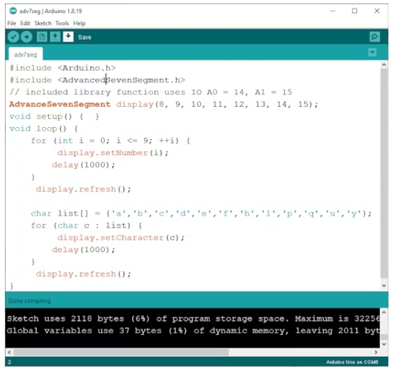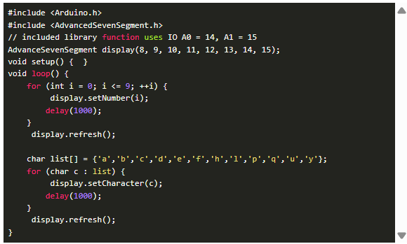 打開Arduino草圖并復(fù)制這段代碼。它需要包含的庫。顯示模塊循環(huán)通過數(shù)字0到9,然后在7段顯示上工作的一些字母數(shù)字。