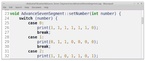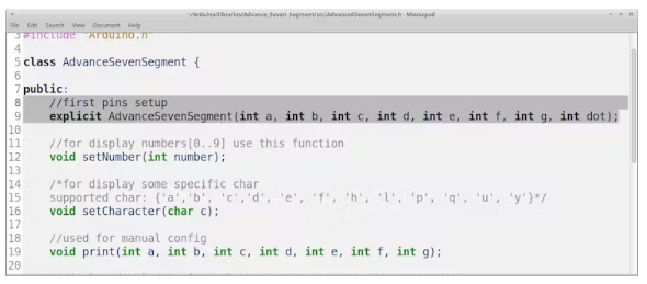 它添加了兩個源代碼文件,您可以打開并讀取、修改它們。頭文件是AdvanceSevenSegment.h,它為我們將要使用的函數(shù)提供了一個聲明。我們在代碼中包含了這個頭文件,并且這個庫中的函數(shù)可以在我們的草圖中使用。