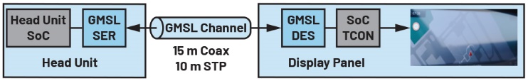 圖1為一個簡化的汽車顯示系統(tǒng),其中包括主機、顯示面板以及屏蔽雙絞線(STP)或同軸電纜。其中,汽車主機,常被稱為信息娛樂系統(tǒng),是車輛中音頻、娛樂、導航和連接功能的中心控制樞紐。在現(xiàn)代汽車中,先進的人機交互界面已成為標配,如準確的語音識別、反應迅速且觸感流暢的觸摸屏,以及復雜多變的手勢控制等。