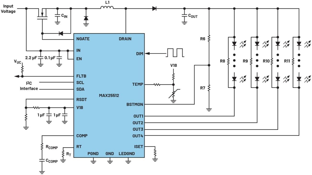 MAX2550x是一款集成PMOS的矩陣LED驅動器,VLED工作電壓可達14 V。因此能夠支持單個分區(qū)中最多串聯(lián)四個LED (4S1P)。內部PMOS優(yōu)化了電流環(huán)路,從而改善了EMI性能并消除了鬼影。此外,得益于PMOS的內部控制,系統(tǒng)復雜性和尺寸也得以減小。
