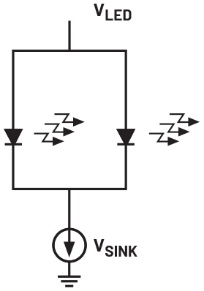 對于側光式背光,顯示屏尺寸、分辨率和亮度取決于LED燈串數(shù)量和每串的LED數(shù)量。而對于直下式背光,則通過LED分區(qū)控制實現(xiàn)對顯示面板的大尺寸、高分辨率和高對比度需求。圖5為兩個LED并聯(lián)后串聯(lián)一個LED的配置(1S2P)。背光驅動和光學要求共同決定了LED配置,例如1S2P或2S1P。其中,VLED用于提供LED正向電壓,而VSINK是維持LED所需恒定電流的電壓。