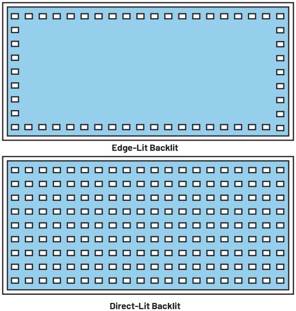 如圖3所示,mini-LED以矩陣形式均勻分布,位于LCD面板的正下方。每個mini-LED的亮度均可獨立動態(tài)調節(jié),以適應圖像內容的變化。這種調光方法稱為局部調光,能夠大大提高對比度。與側光式顯示屏相比,直下式背光的功耗較低。當顯示圖像中的深色內容時,直下式背光可以關閉深色圖像分區(qū)的LED,同時還能減輕顯示深色內容圖像時的漏光現(xiàn)象。
