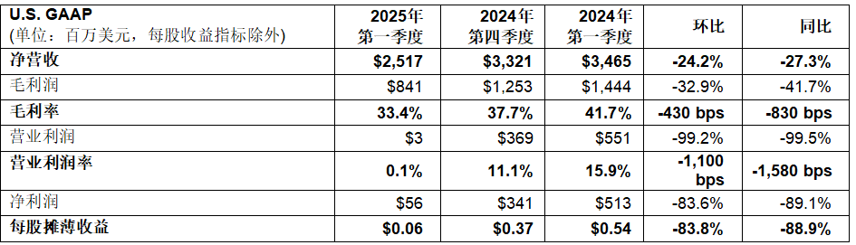 ?第一季度凈營(yíng)收25.2 億美元;毛利率 33.4%;營(yíng)業(yè)利潤(rùn)300萬美元;凈利潤(rùn)5,600萬美元