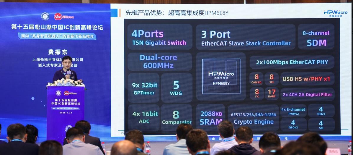 2025年5月12日,在東莞市松山湖凱悅酒店舉行的第十五屆松山湖中國(guó)IC創(chuàng)新高峰論壇上,上海先楫半導(dǎo)體嵌入式專家及產(chǎn)品總監(jiān)費(fèi)振東先生發(fā)表了題為《HPM6E8Y:機(jī)器人關(guān)節(jié)“芯”時(shí)代的實(shí)時(shí)控制芯片》的演講。費(fèi)先生向與會(huì)者介紹了HPM6E8Y芯片,這款專為機(jī)器人關(guān)節(jié)控制設(shè)計(jì)的芯片,及其在推動(dòng)機(jī)器人和具身智能發(fā)展中的重要作用。他還分享了上海先楫半導(dǎo)體在高性能微控制器(MCU)領(lǐng)域的創(chuàng)新成果及其對(duì)行業(yè)未來的展望。