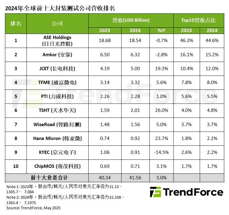 TrendForce集邦咨詢: 2024年全球前十大封測廠商營收合計(jì)415.6億美元,年增3%