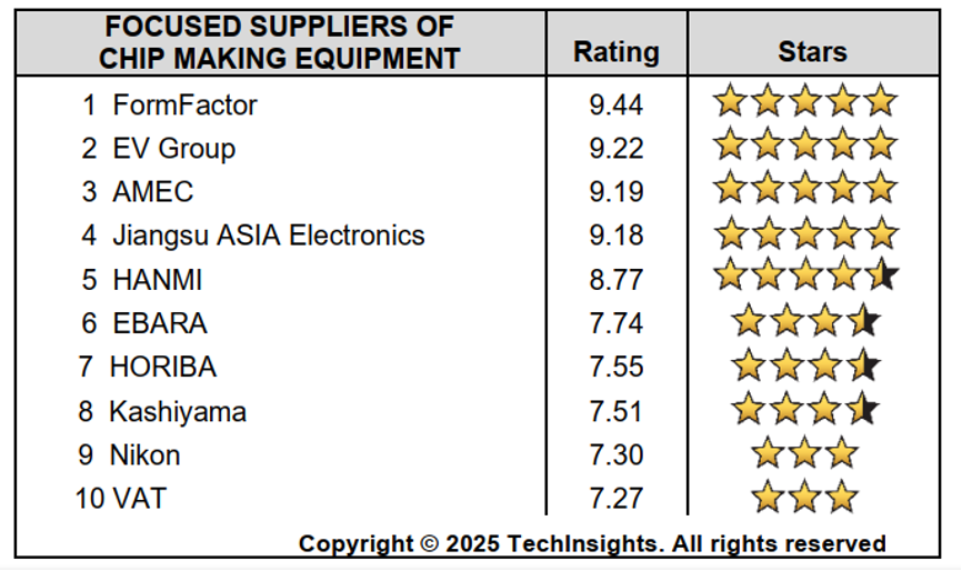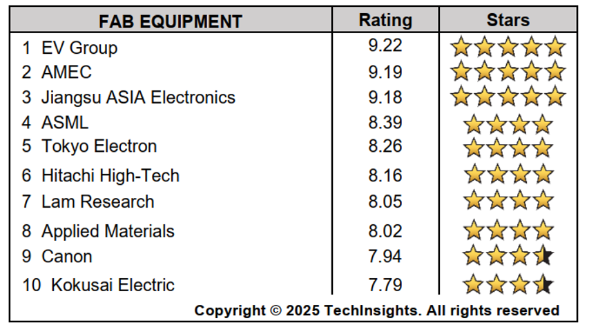 全球半導(dǎo)體供應(yīng)商大獎(jiǎng)——晶圓廠設(shè)備(GlobalSemiconductorSupplier Awards -FabEquipment)中排名第二