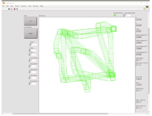 當所有的“松露”都被收集完畢后,機器人會返回到之前繪制的標簽位置,并將每一塊松露放在相應(yīng)的彩色編碼區(qū)域。由于該計劃的性質(zhì),下車地點可能不像期望的那樣準確。為了解決這個問題,用戶還可以在球自動掉落之前操作機器人15秒,以減輕任何糟糕的地圖位置。這種遠程操作是通過LabVIEW通過WiFi(到樹莓派)與機器人進行串行通信來執(zhí)行的。(有關(guān)LabVIEW接口的更多細節(jié),請參閱附加功能)。