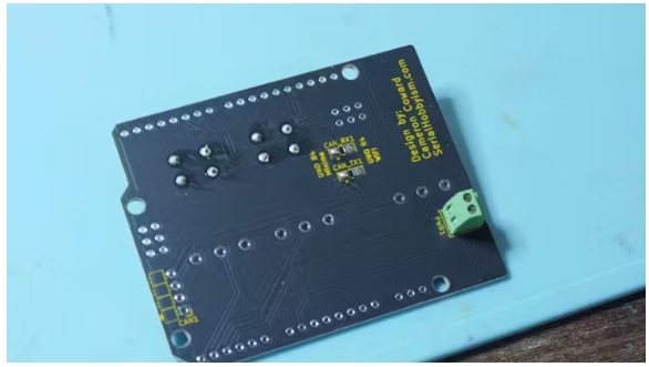 把橋焊好!與Arduino Uno R4 WiFi相比,Arduino Uno R4 Minima使用不同的引腳進行CAN連接。這種焊料橋使得相同的屏蔽與兩者一起工作。只需在你正在使用的Arduino的側(cè)面焊接即可。