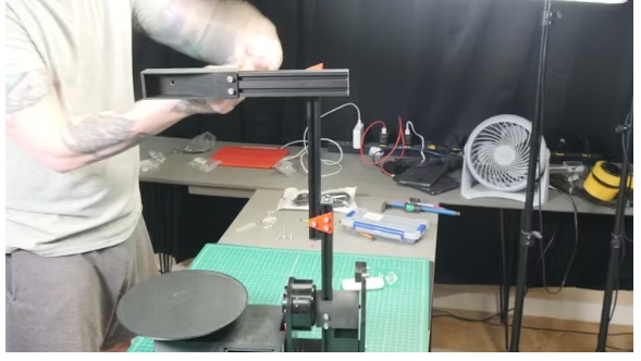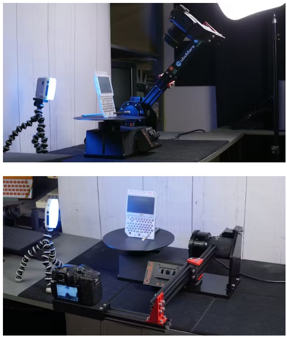 這些機器人有兩個自由度:一個旋轉(zhuǎn)轉(zhuǎn)臺和一個旋轉(zhuǎn)臂。拍攝對象放在轉(zhuǎn)盤上,相機安裝在手臂上。