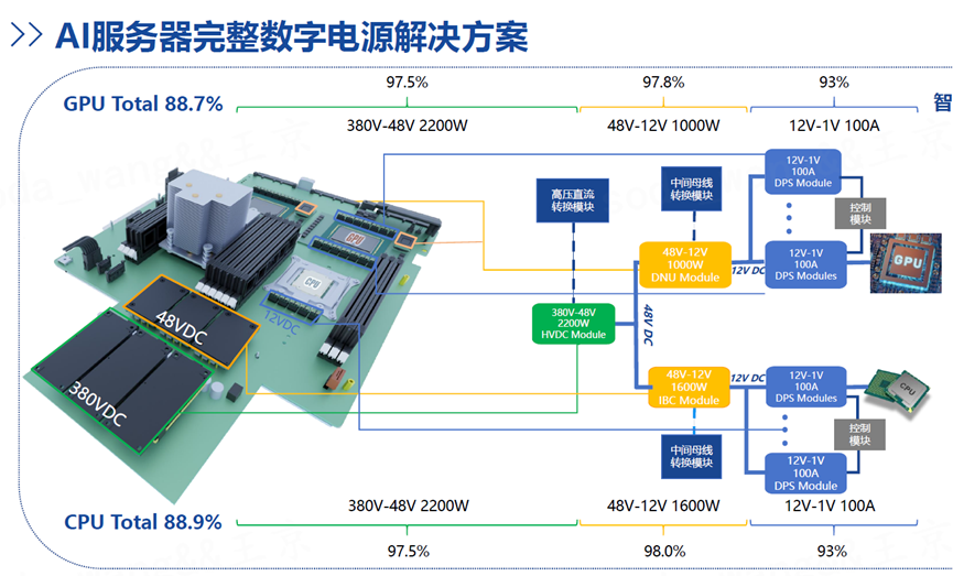 針對AI服務(wù)器高功率密度、高效率的電源需求,以及低電壓大電流的CPU&GPU供電需求,世強結(jié)合代理廠牌以及AE研發(fā)資源,推出一套從380V到1V全套服務(wù)器數(shù)字電源解決方案;包含380V轉(zhuǎn)48V2500WHVDC模塊、48V-12V2000WIBC模塊、12V-1V多相控制器,DRMOS、芯片電感一系列產(chǎn)品;