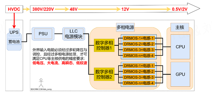 與此同時,隨著芯片制造工藝從7納米一路進化到3納米,GPU的核心工作電壓已經(jīng)降到了0.65到0.9V之間。這種“電壓越來越低,電流越來越大”的升級,對GPU的供電提出了更大的挑戰(zhàn),尤其對VRM模塊和負(fù)載點電源(POL)帶來更嚴(yán)苛的需求,而傳統(tǒng)的直流電源模塊(DCDC)無法滿足最新產(chǎn)品的性能需求。