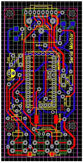 電路工作在3.3V。輸入可以是0V到3-5V之間的TTL邏輯電平,如果確實需要,可以更多,因為R2=4.7K, R3=10k和Q1=BC337將控制MCU輸入端口的信號。R4和R5作為分壓器用于測量電池電壓,當(dāng)需要充電時,蜂鳴器會提醒您。按下暫停鍵時紅色LED亮起;在暫停模式下,數(shù)據(jù)停止?jié)L動,緩沖區(qū)被清空。另一個按鈕用于清除屏幕,最后一個按鈕用于改變所需的速度(300、1200、2400、4800、9600、19200和38400)。