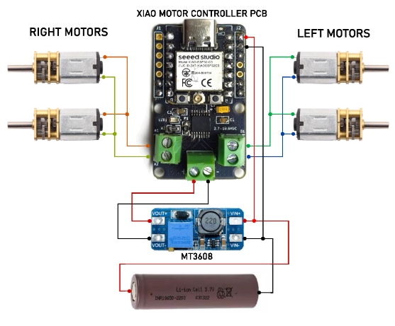 將一個2針JST連接器和另外兩根電線焊接到MT3608的輸入板上。此外,焊接一些電線到輸出。我使用MT3608的原因是它可以作為電壓升壓器,允許我們將電池的3.7V增加到電機驅(qū)動器的10.8V。我們將直接從電池輸出中為肖供電。請確保不要將升壓電壓連接到Xiao的電源輸入,因為這可能會損壞它。