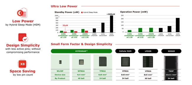 因應(yīng)新興消費(fèi)趨勢如可穿戴及智能設(shè)備等低耗電的市場需求,HYPERRAM 設(shè)計之理念在于取代傳統(tǒng)過去使用的 SDRAM,與 SDRAM 相比,其在工作方面能降低70%碳排量,待機(jī)能耗更降低至5%。