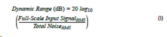 使用式1中的公式求解折合到輸出端的等效總噪聲,結(jié)果低至1.12 μV rms(OSR = 1024×,最低增益設(shè)置)。因此,動態(tài)范圍測量結(jié)果較大,意味著整體系統(tǒng)噪聲較低。