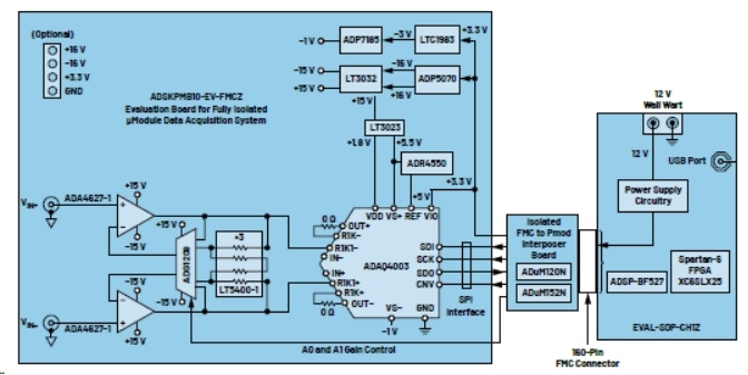 圖1.單通道、完全隔離、低延遲數(shù)據(jù)采集系統(tǒng)ADSKPMB10-EV-FMCZ的簡化框圖