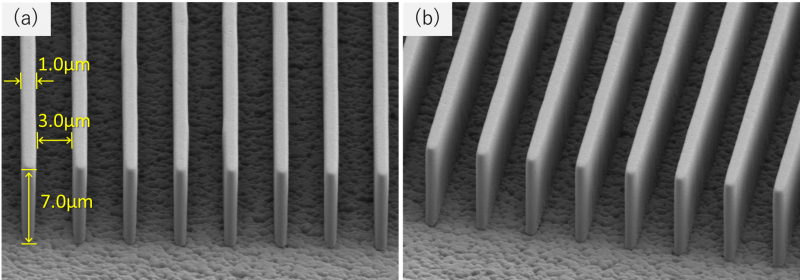 (c)干膜剝離后橫截面圖:電鍍圖案(線寬/線距=3.0/1.0μm)