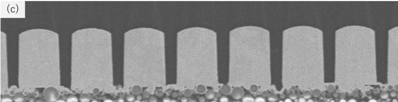 本次推出的“TA系列”正是基于這一市場需求而研發(fā)。通過采用旭化成長期積累的感光性材料技術(shù),并結(jié)合全新的材料設(shè)計(jì),該系列產(chǎn)品在RDL形成所需的4μm節(jié)距設(shè)計(jì)條件下,利用LDI曝光可實(shí)現(xiàn)1.0μm線寬的圖案形成,是非常適用于面板級(jí)封裝※4等微細(xì)配線形成的感光干膜材料(見圖a、b)。所形成的微細(xì)光刻圖案,經(jīng)過SAP(加成法)※5電鍍圖案形成工藝以及后續(xù)光刻膠剝離步驟后,可在4μm節(jié)距設(shè)計(jì)條件下實(shí)現(xiàn)3μm線寬的電鍍圖案形成(見圖c)。