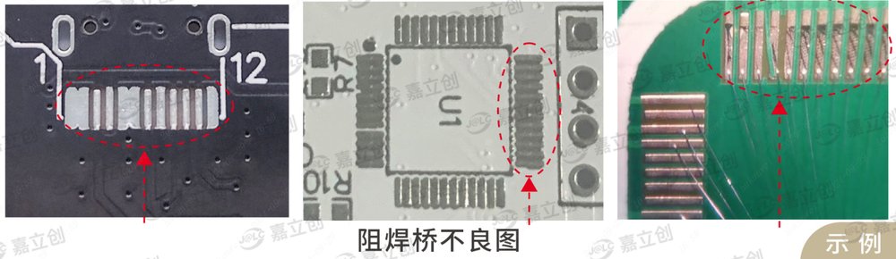 從圖片可以看到,存在阻焊橋脫落,兩個(gè)引腳焊盤(pán)連錫的情況,究其原因就是阻焊橋?qū)挾忍?,小于最小工藝參?shù)導(dǎo)致的。那如何避免出現(xiàn)這種現(xiàn)象呢,就要從設(shè)計(jì)端和制造端兩個(gè)方面考慮了。