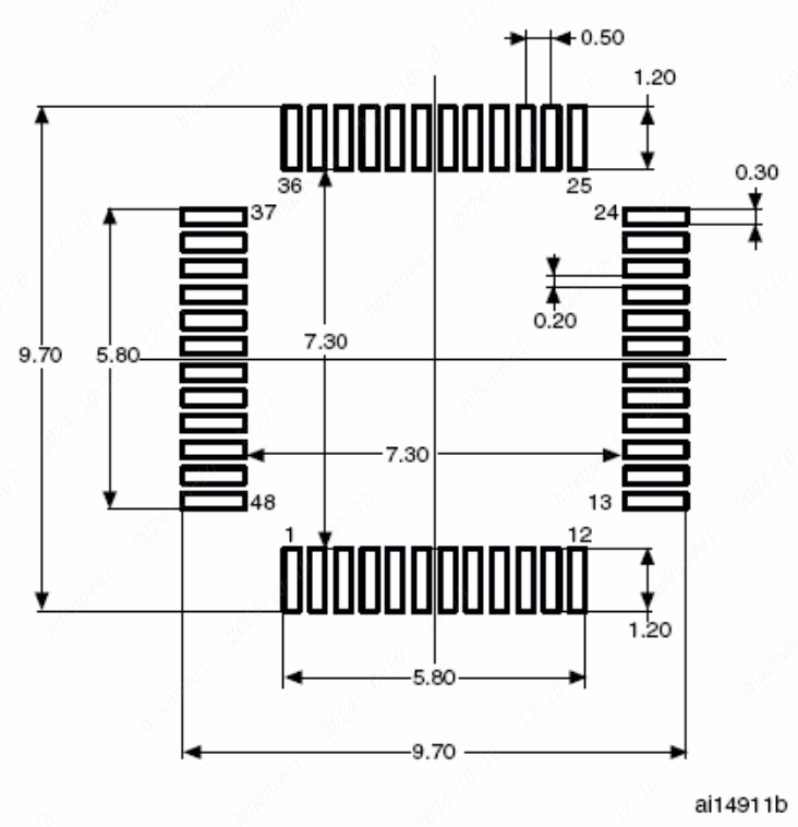 特意找了一下STM32F103c8t6,LQFP48引腳的封裝的引腳間距,可以下載你要用的芯片的數(shù)據(jù)手冊(cè),注意:是數(shù)據(jù)手冊(cè),不是參考手冊(cè)哦。在數(shù)據(jù)手冊(cè)里面封裝特性這一章節(jié),可以看到要使用的芯片兩個(gè)引腳之間的間距是多少。這個(gè)圖可以看出STM32F103c8t6這款芯片兩個(gè)引腳之間的中心間距是0.5mm,邊緣間距是0.2mm。