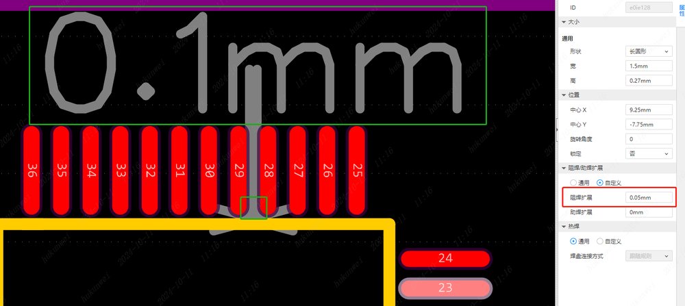 這里我們可以看到,這個(gè)芯片的阻焊擴(kuò)展默認(rèn)寬度是0.05mm,那么引腳左右就要0.1mm,通過(guò)理論計(jì)算阻焊橋的寬度就剩下0.1mm,同時(shí)我也測(cè)了一下阻焊橋之間的寬度剛好是0.1mm,這個(gè)參數(shù)剛好卡在了1oz銅厚的極限值,生產(chǎn)出來(lái)的高多層板不會(huì)出現(xiàn)阻焊橋脫落的問(wèn)題。