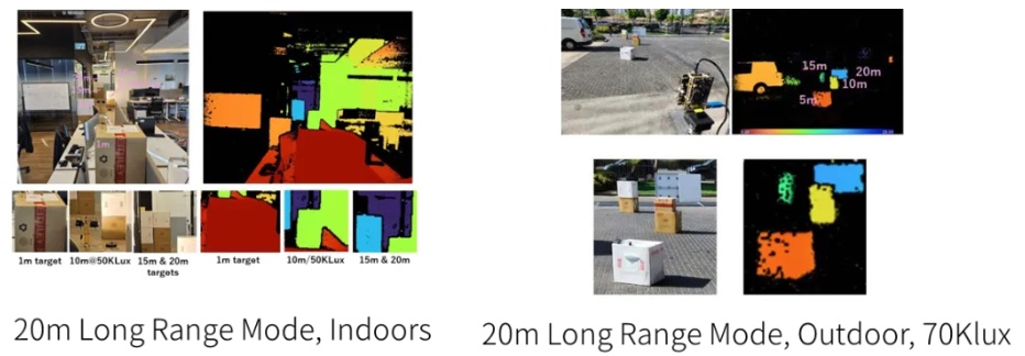 此外,這些產(chǎn)品還支持像素合并。如果 VGA 分辨率足夠,那么將 120 萬像素進(jìn)行像素合并,可以提高 VGA 傳感器的靈敏度。距離分辨率取決于調(diào)制頻率。與市面上的常規(guī)方案相比,我們的產(chǎn)品可以使用相對較高的 200MHz 調(diào)制頻率。因此,我們的產(chǎn)品性能可擴(kuò)展,既支持短距離、高精度感知,也支持長距離、高分辨率感知。