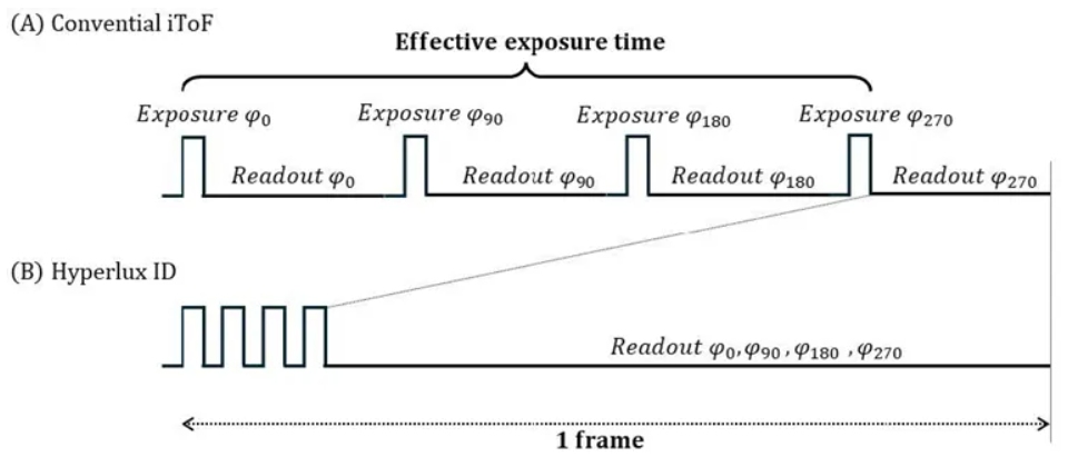 如前所述,間接飛行時間 (iToF) 法通過接收以特定頻率調(diào)制的照射光的反射波并計(jì)算相移來確定深度。為了確定相移,采用四個調(diào)制信號進(jìn)行測量,其相位分別偏移 0°、90°、180° 和 270°。因此,至少需要四次曝光才能獲得單個深度幀信息。