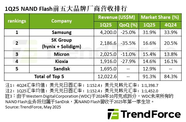 TrendForce集邦咨詢: 2025年第一季前五大NAND Flash品牌廠營收合計120.2億美元