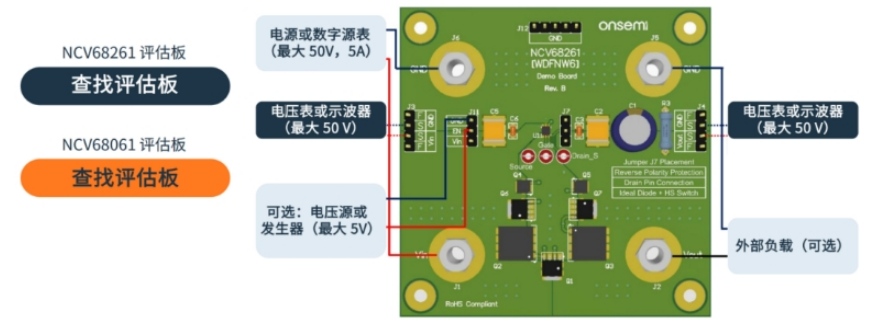 以下兩款理想二極管控制器均可使用評估板: NCV68061 和 NCV68261。 用戶可利用評估板在各種配置中測試控制器, 可通過評估板上的跳線設(shè)置所需的保護(hù)模式。 連接的電源電壓應(yīng)在 -18 V 至 45 V 之間, 不得超過器件的最大額定值。 通過附加跳線, 可使用評估板的預(yù)設(shè)布局或使用外部連接信號(hào)來控制器件。