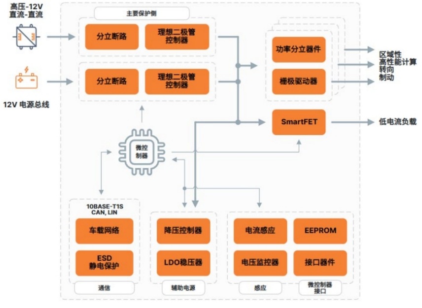 PDU 可將電力智能分配至車內(nèi)的各個(gè)區(qū)域, 確保高效可靠的電源管理。 PDU 可直接為大電流負(fù)載供電, 也可將電力分配給多個(gè)區(qū)域控制器 (ZCU)。 ZCU 則在各自區(qū)域內(nèi)進(jìn)一步管理配電, 從而大大減輕了線束的重量和復(fù)雜性。 目前有多種方案可供選擇, 能夠滿足不同汽車制造商及其車型的特定要求。 下面的框圖簡要展示了 PDU 的組成結(jié)構(gòu):
