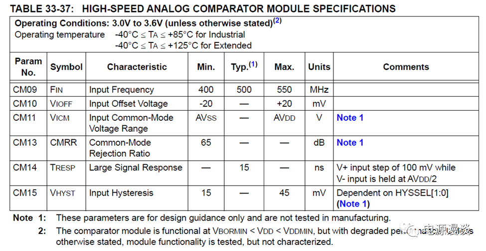 圖1 比較器內(nèi)部結(jié)構(gòu)從這個圖上可知,所有DAC都可以通過使能其輸出在DACOUT1上輸出,但是需要注意任何一個時刻只能輸出一個DAC信號,這個信號可以用于調(diào)試觀察電路信號??驁D上除了展示了正和負(fù)輸入之外,還指出了比較器輸出極性修改,輸出濾波,輸出觸發(fā)中斷,及對PWM模塊的作用等,功能一目了然。除了原理框圖,比較器有一些典型參數(shù),在規(guī)格書的電氣信息部分也有說明,如圖2所示,
