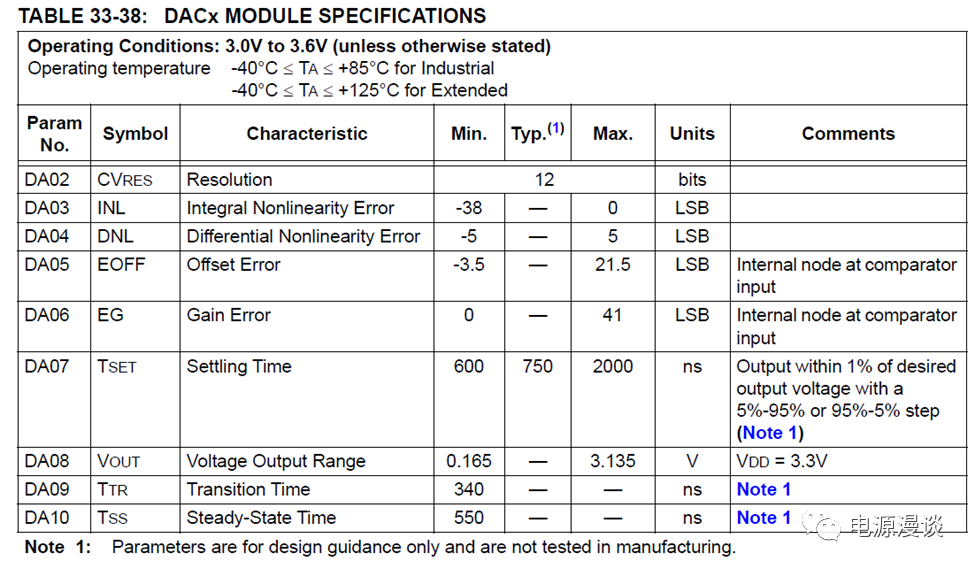 圖4 DAC輸出規(guī)格從上述說明看,DAC的輸出驅(qū)動能力非常小,只有3mA,所以在使用中需要注意DAC輸出時其負(fù)載有多大,且提供合適的輸出負(fù)載電阻(不可小于10kohm)和負(fù)載電容(不可大于30pF)。